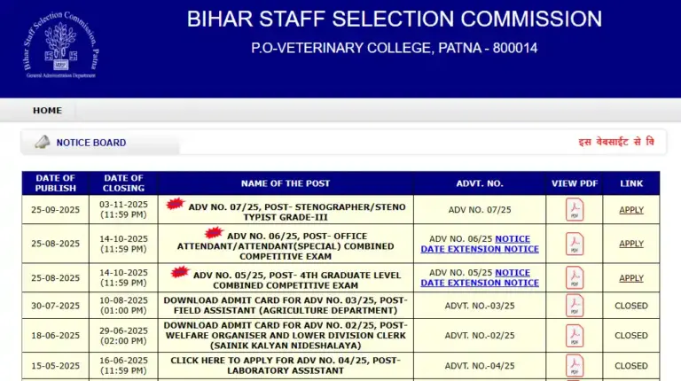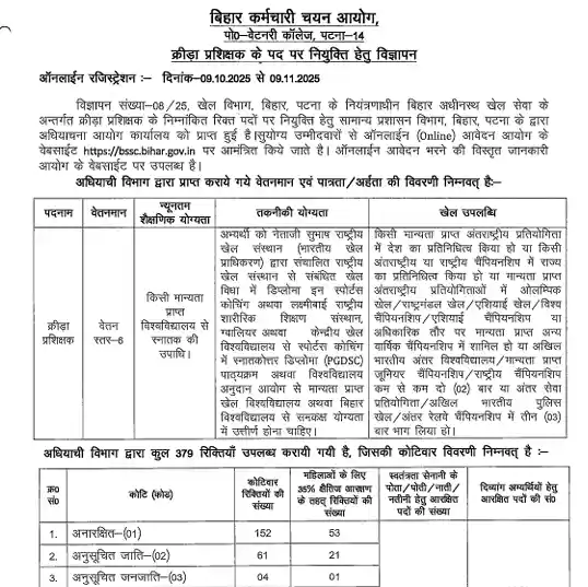 Bihar BSSC Sports Trainer Recruitment 2025: Bihar Staff Selection Commission (BSSC), has released a notification on official website for the recruitment of Sports Trainer (Sport Dept. Govt. of Bihar) Post. This recruitment is for 379 positions. BSSC Application Form will start from 09 October 2025 & the candidates can apply till the 09 November 2025. Minimum age required is 21 Years & The Maximum Age Is 42 Years (Post Wise) as on 01 August 2025. Candidates must check the complete details for Bihar BSSC Sports Trainer Recruitment 2025. Link are given below. (Advt.No. 08/2025)