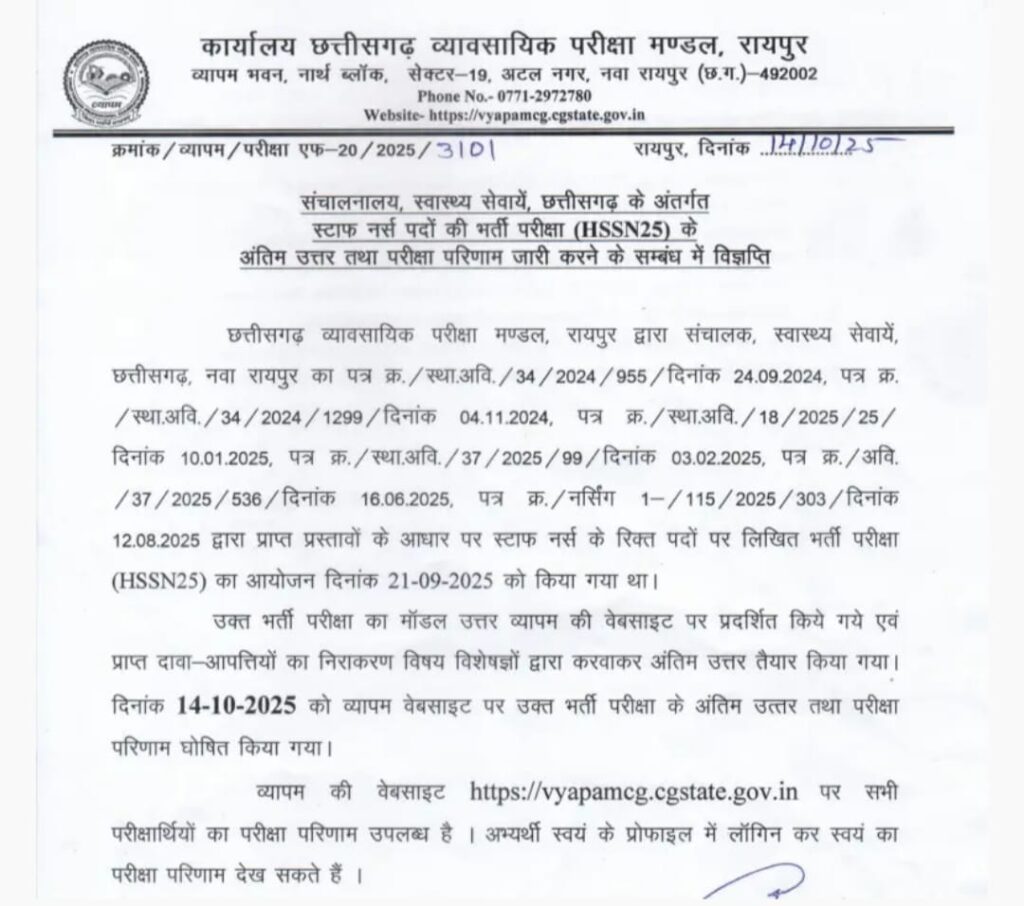 The CG Vyapam Staff Nurse Result 2025 has been officially released by the Chhattisgarh Professional Examination Board (CG Vyapam). Candidates who appeared for the Staff Nurse examination 2025 can now check their results, download their score card, and view the merit list online. This is a crucial update for aspirants waiting to move to the next stage of recruitment.